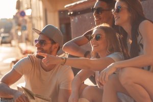 Group of friends on vacation with map sitting at town square and having good time. Een reactie plaatsen